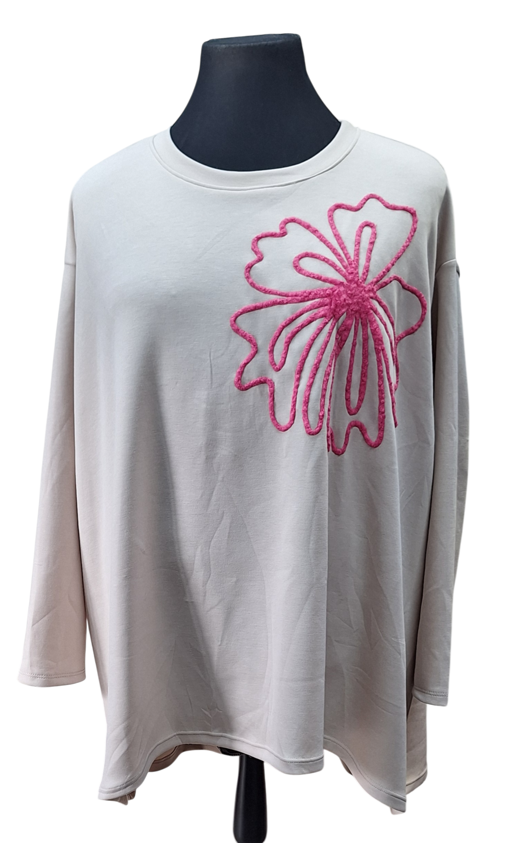 Sweater met een grote bloem voorop. Deze loopt aan de onderkant wat wijder uit.
