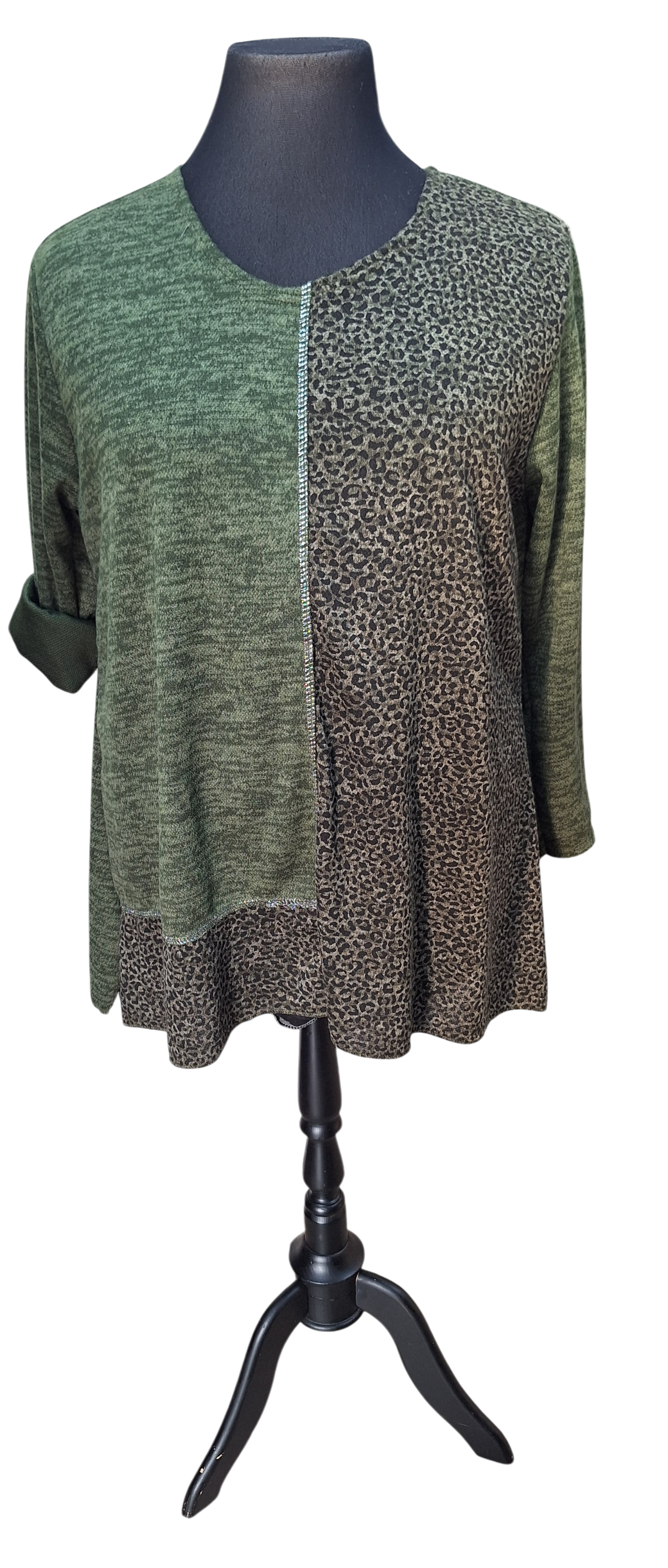 Dunnere A-lijn truien met een ronde hals. Met aan de voorkant voor de helft een panterprint. Deze heeft ook een zilver lurexdraadje. Onderop 2 kleine splitjes.