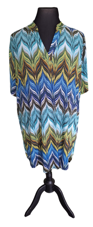 Nu ook tunieken voor een grotere maat. Aan de achterkant zit een extra plooi voor meer ruimte. De tunieken zijn er in diverse printen. Deze hebben een V-hals en korte mouwen.