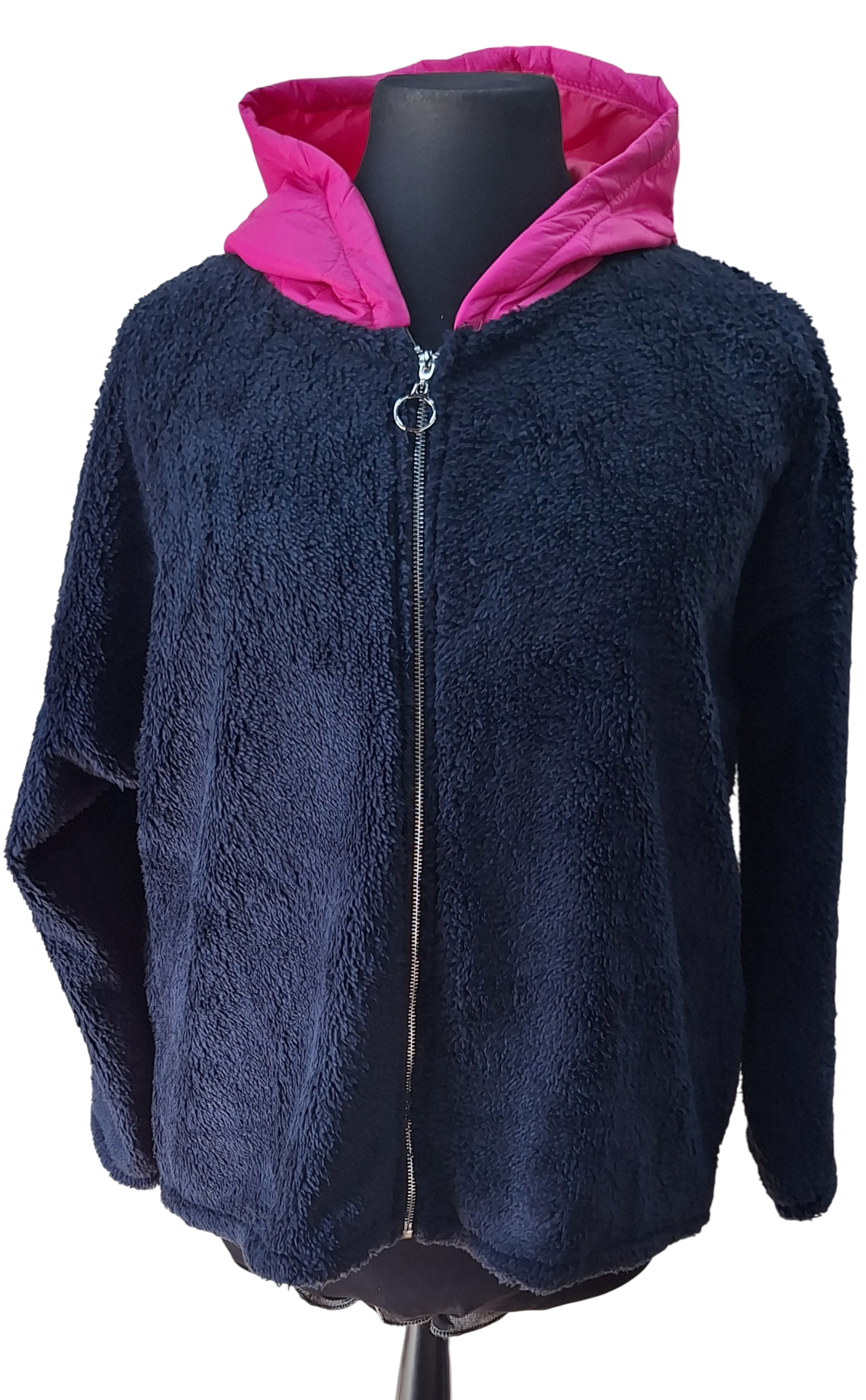 Heerlijk warm vest zonder zakken. Deze heeft een knalroze capuchon. Binnenkant is gevoerd met een zachte stof.
